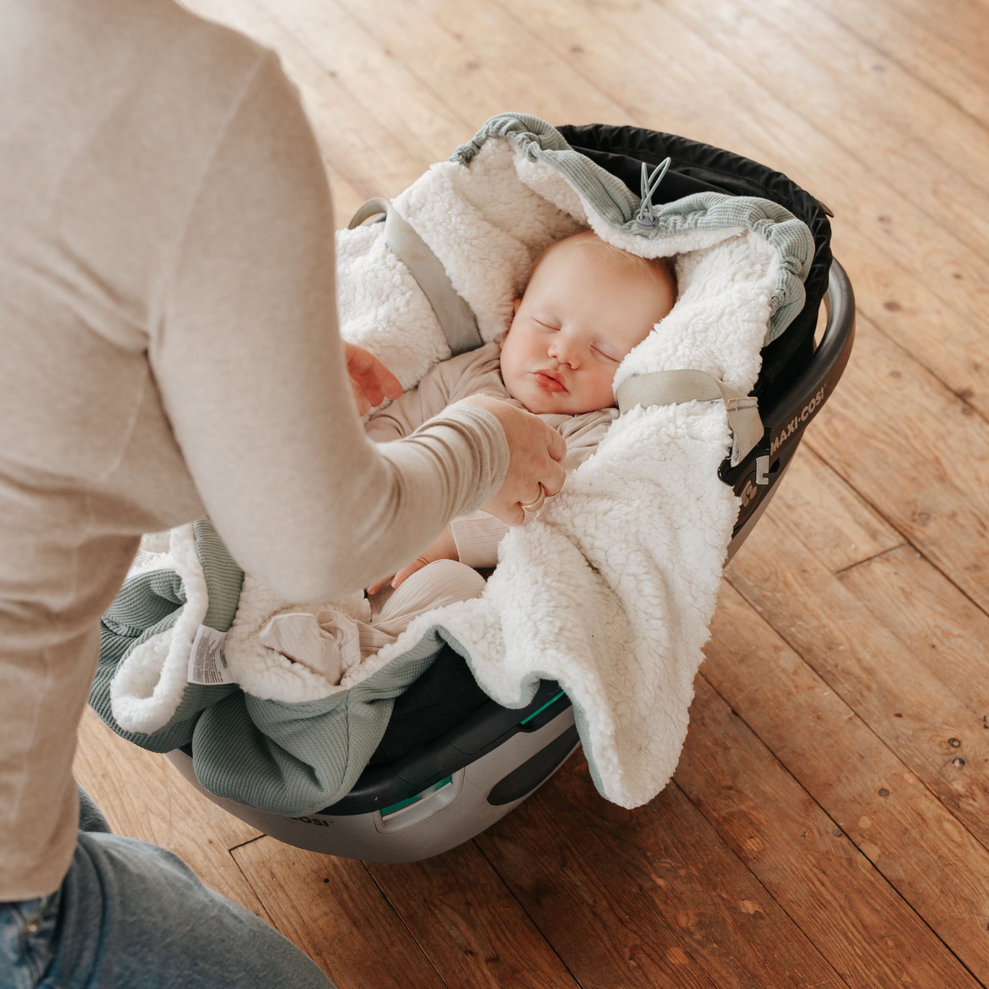 La nostra coperta avvolgente è ideale per il Maxi Cosi. Grazie alle sue fessure, è adatta a tutti i sistemi di imbracatura a 3 e 5 punti. Tuttavia, assicuratevi sempre che le cinghie siano ben strette durante il fissaggio.