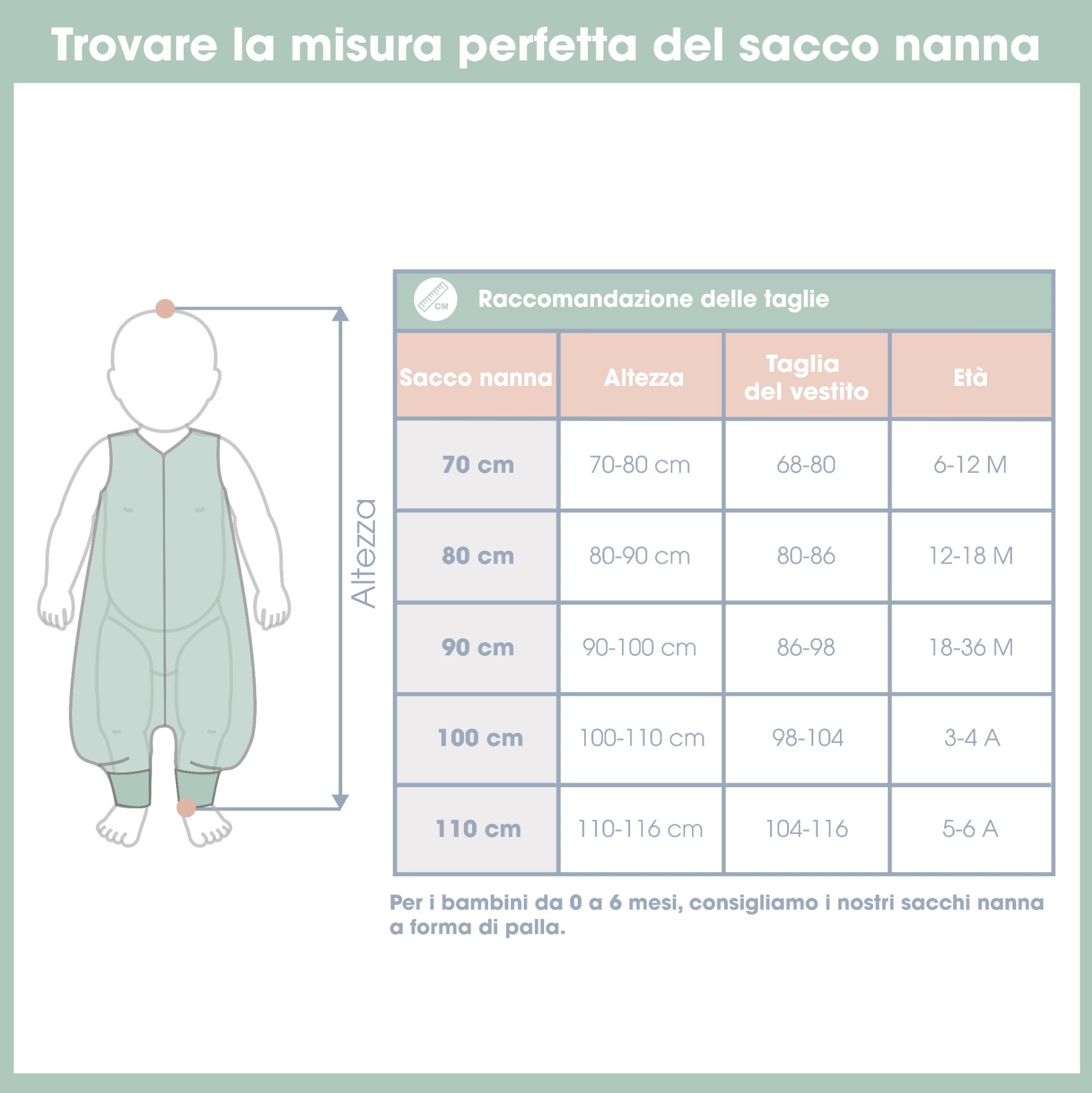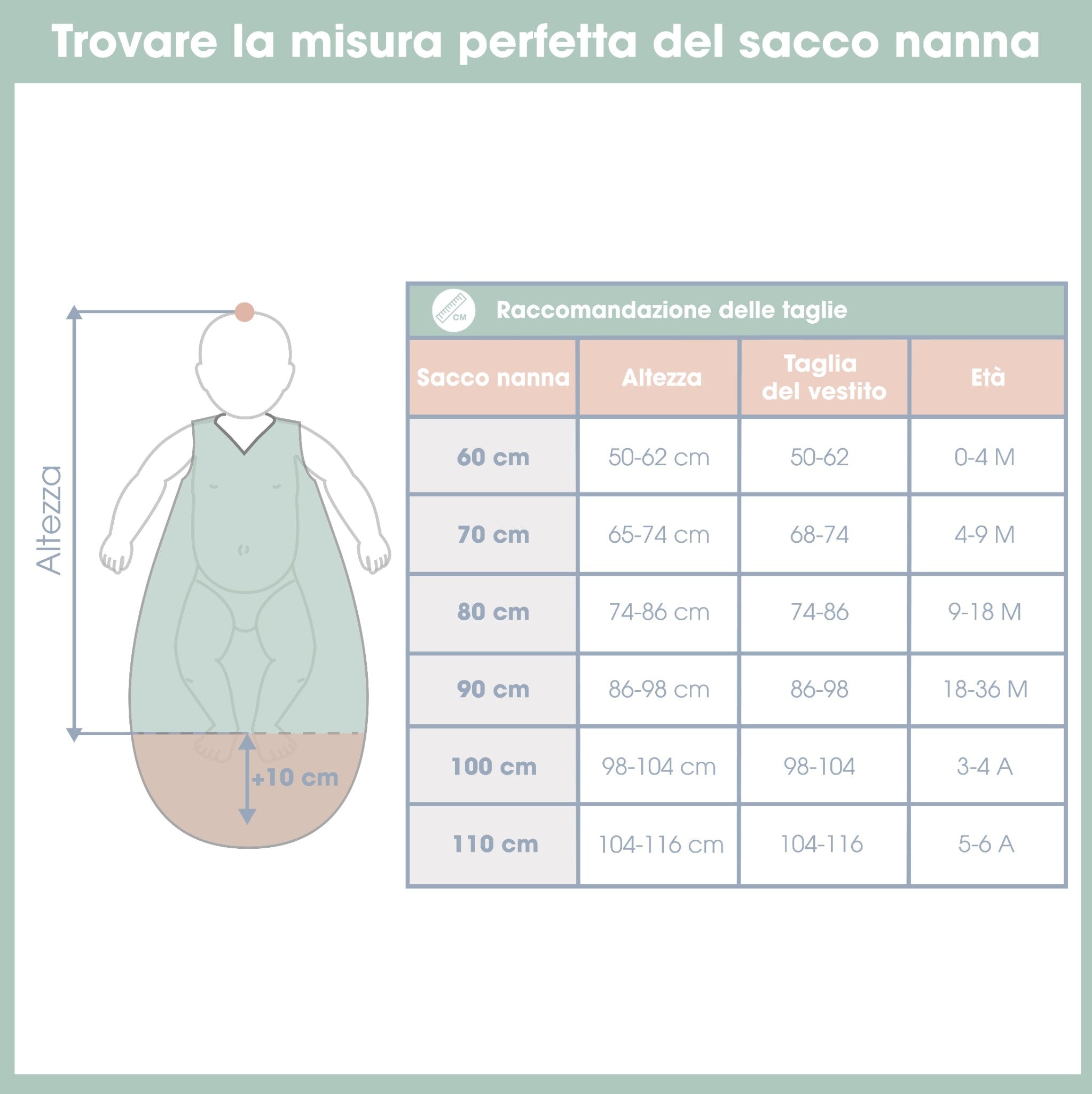 Per un sonno sicuro è fondamentale scegliere la taglia corretta, così che il bambino non possa scivolare all’interno del sacco. Una semplice regola: il bambino cresce fuori dal sacco nanna – non dentro. Le nostre comode tabelle taglie disponibili sulle pagine prodotto ti aiutano a trovare facilmente la misura giusta.