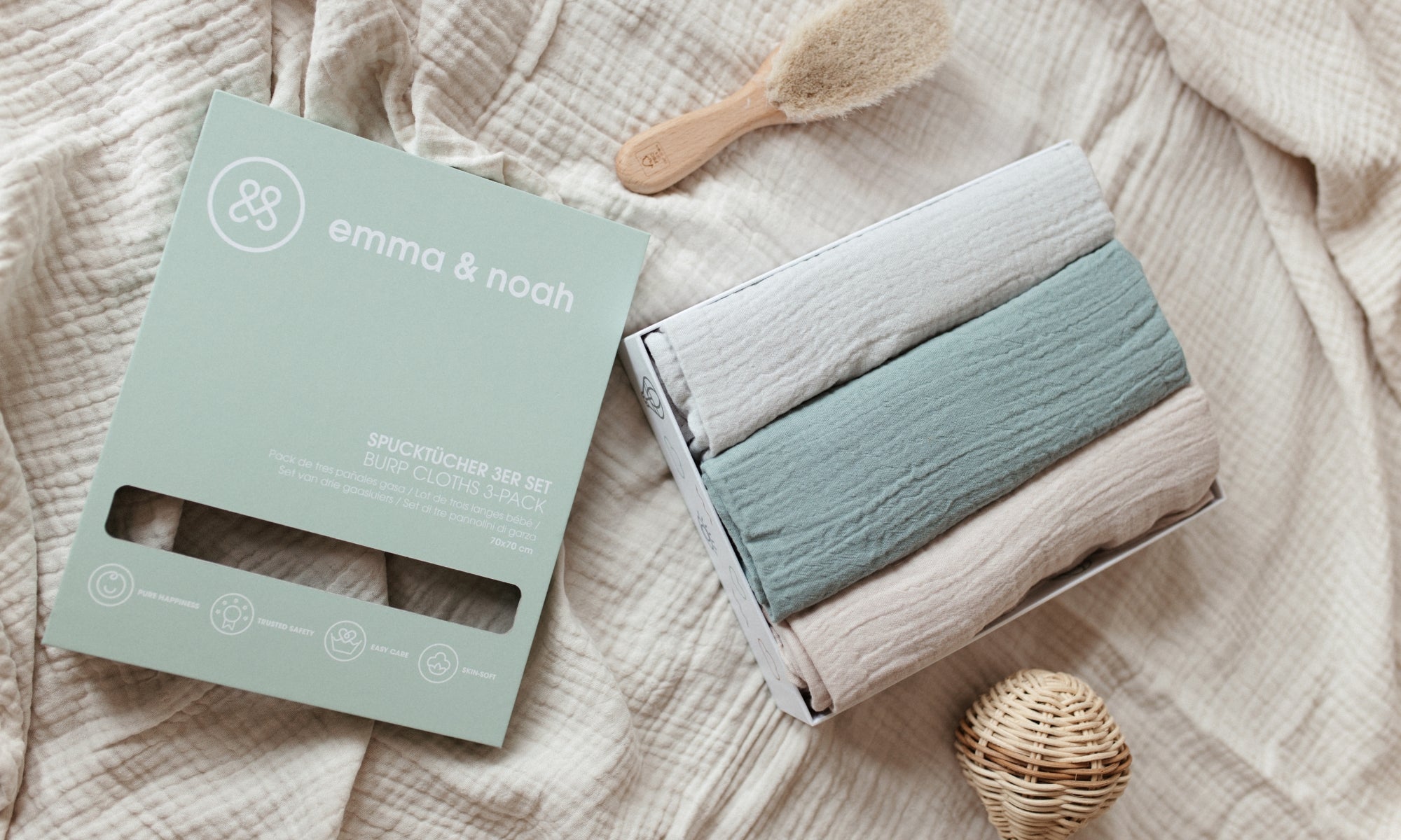 I motivi disegnati con amore e la confezione elegante li rendono anche un meraviglioso regalo per una nascita o un baby shower – pratici, belli e sempre ben accetti.